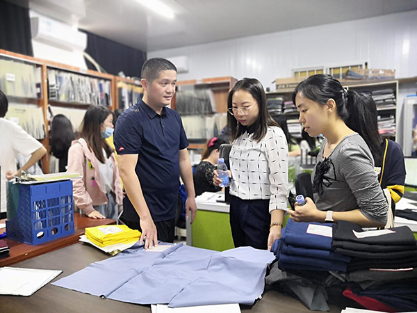 联兴发公司董事长蔡俊杰亲自向学子们介绍了公司的基本情况、发展历史和企业文化理念,并简要讲述了公司的主营产品和下一步的发展思路,分享了国内纺织行业的发展现状。随后实践团主要参观了生产车间、检测室、仓库等。在听取了现场讲解和汇报后,同学们对公司的产品产生了深厚的兴趣。
